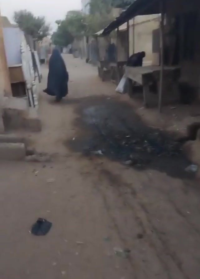 woman walking down a dirt street lined with market stalls, likely early in the morning. The woman is wearing a dark, full-length garment, possibly a burka or abaya, which obscures her features. The street is unpaved and has a dark, oily spill in the center. The market stalls are simple wooden structures with roofs, and some are occupied by individuals. The scene suggests a low-income, possibly rural or urban periphery location. The overall atmosphere seems quiet and still.
