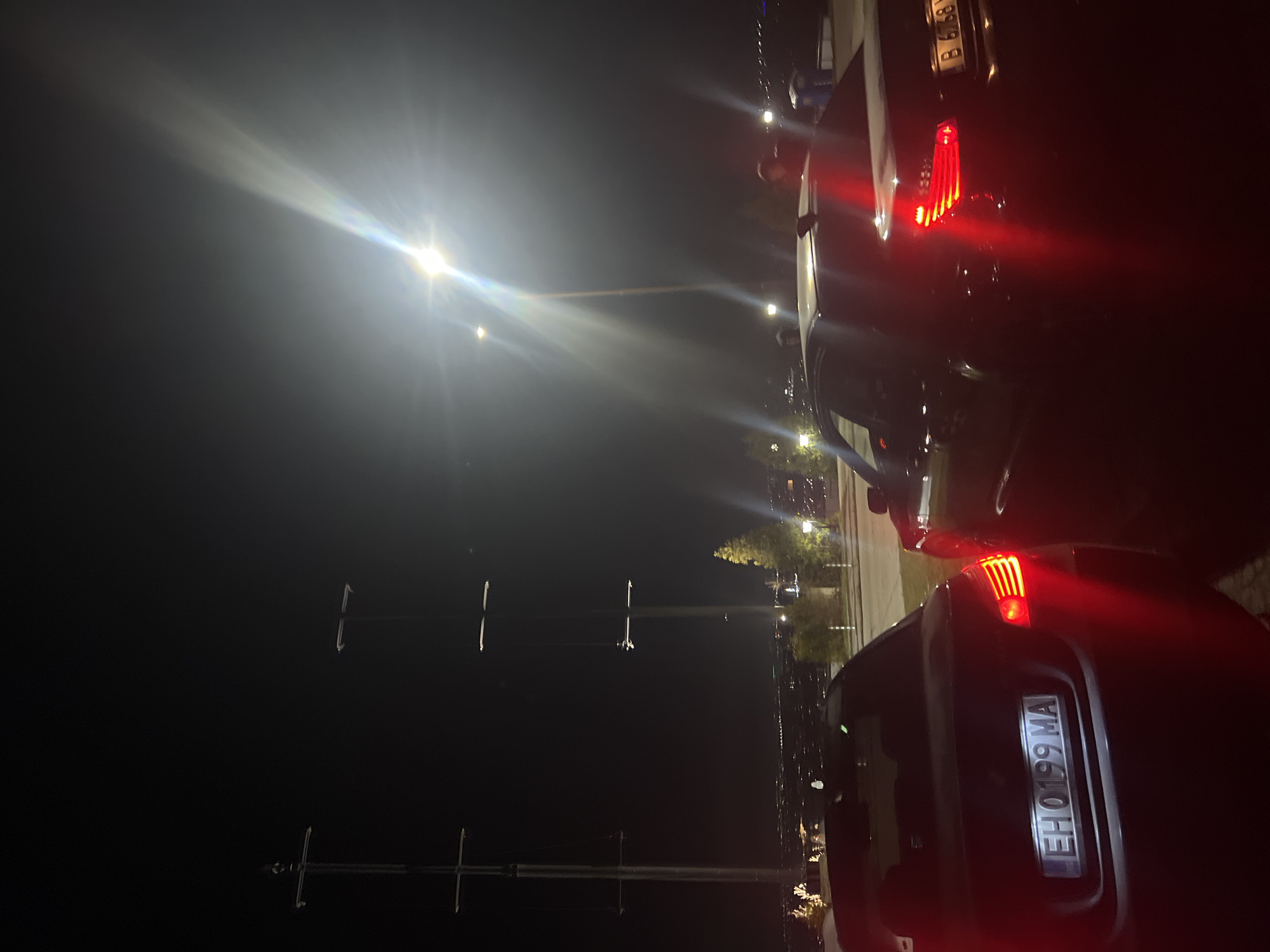 night scene near the Danube River in Ruse, Bulgaria. The view features reflections of street lights and electricity pylons on the water's surface. Parked cars are visible on the right side of the frame, with their taillights illuminated, including license plate EH 0199 MA. People are visible standing near the parked cars.