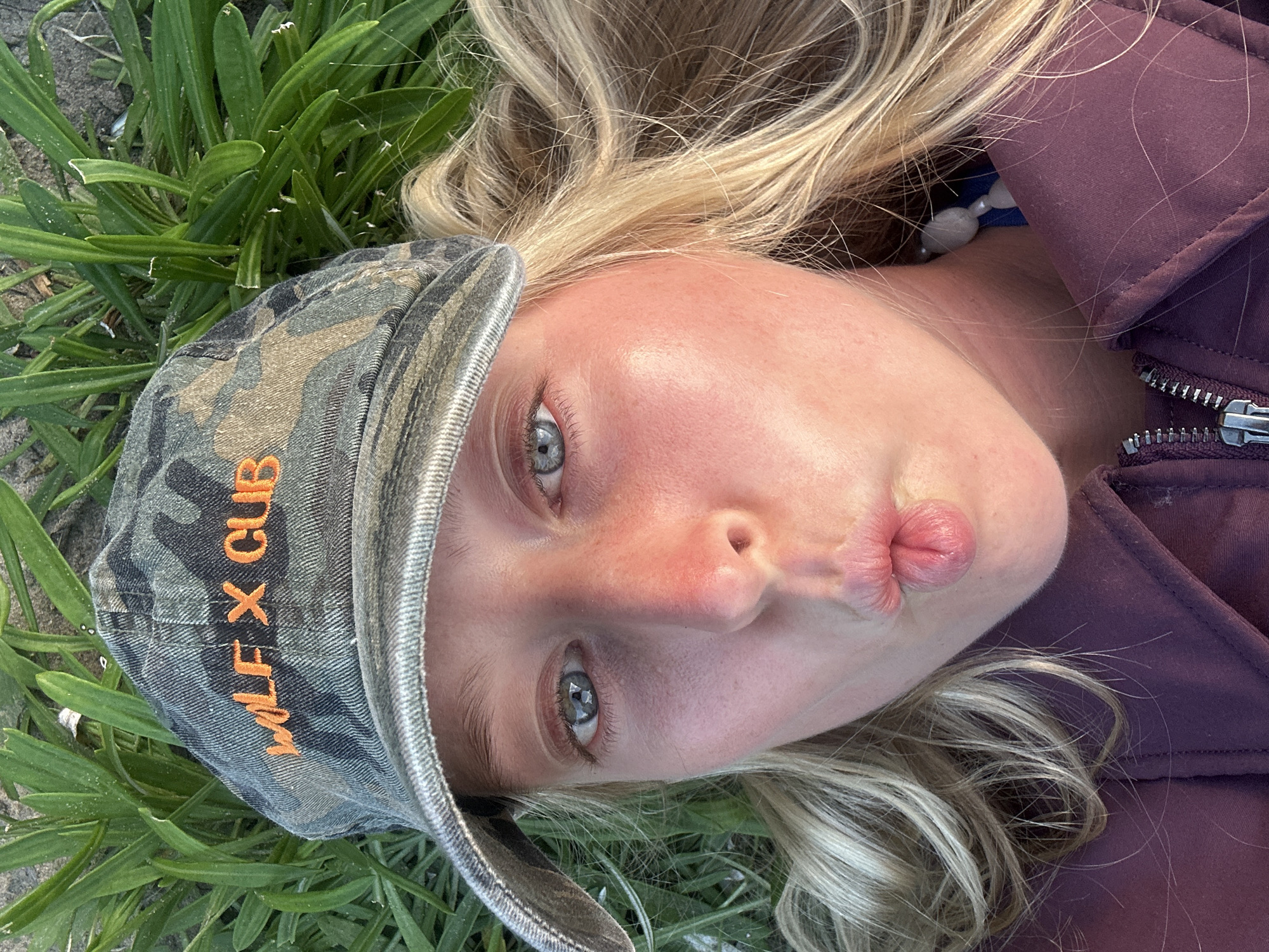 A young Caucasian woman is lying on her back in what appears to be a grassy area. She is wearing a camouflage cap with "WOLFX CLUB" written in orange on the side, and a purple jacket. She has blonde hair and light-colored eyes. Her lips are pursed in a kissing gesture. A necklace with white beads can be seen. The background appears to be green grass or other vegetation. It's impossible to determine the exact location within the Wollongong City Council area without more context or visual cues.