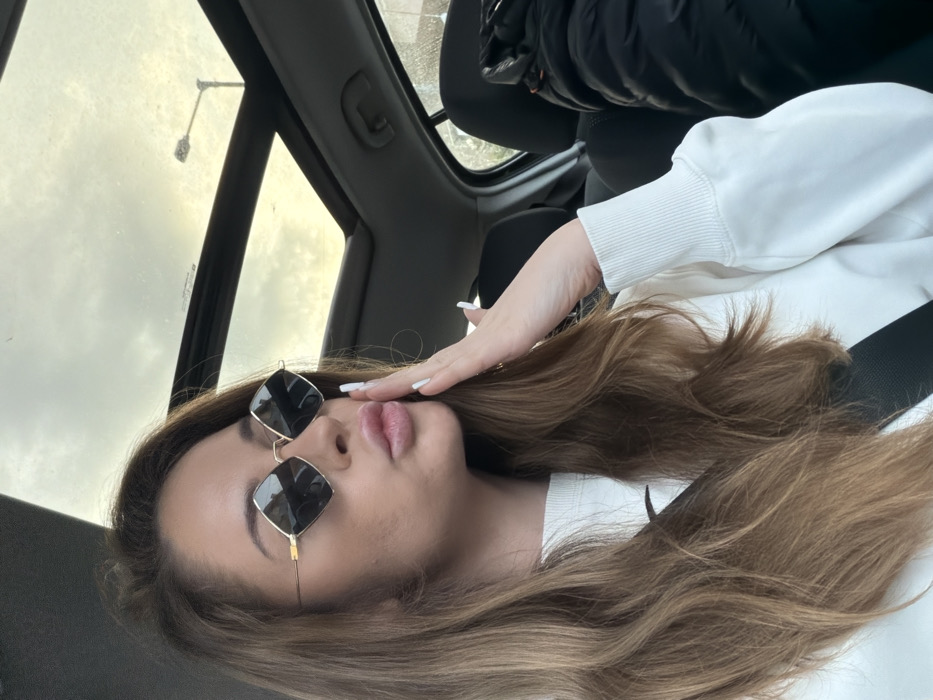 A female subject is depicted from the chest up, seated inside a vehicle. She has long, light brown hair and is wearing a white sweatshirt with a partial dark Nike swoosh logo visible on the chest. A black seatbelt traverses her left shoulder and chest. The subject wears gold-framed, black-lensed, rhombus-shaped sunglasses and has her lips pursed forward in a "kiss" expression. Her left hand, featuring white nail polish, is raised with fingers slightly spread, touching her left cheek. Above the subject, a vehicle sunroof reveals an overcast sky with a street light fixture on a pole visible against the sky in the upper right quadrant. To the subject's right, a dark puffy jacket worn by an obscured passenger is partially visible. The scene is situated within a car in the city of Bankya, Bulgaria.