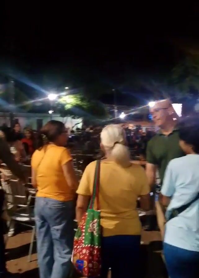The video depicts an outdoor nighttime gathering. A crowd is present, illuminated by stage lights. The camera focuses on a group of individuals; one man embraces another. The environment consists of trees and open space, suggesting a park. The scene includes people of various ages and ethnicities, some walking and others standing still.