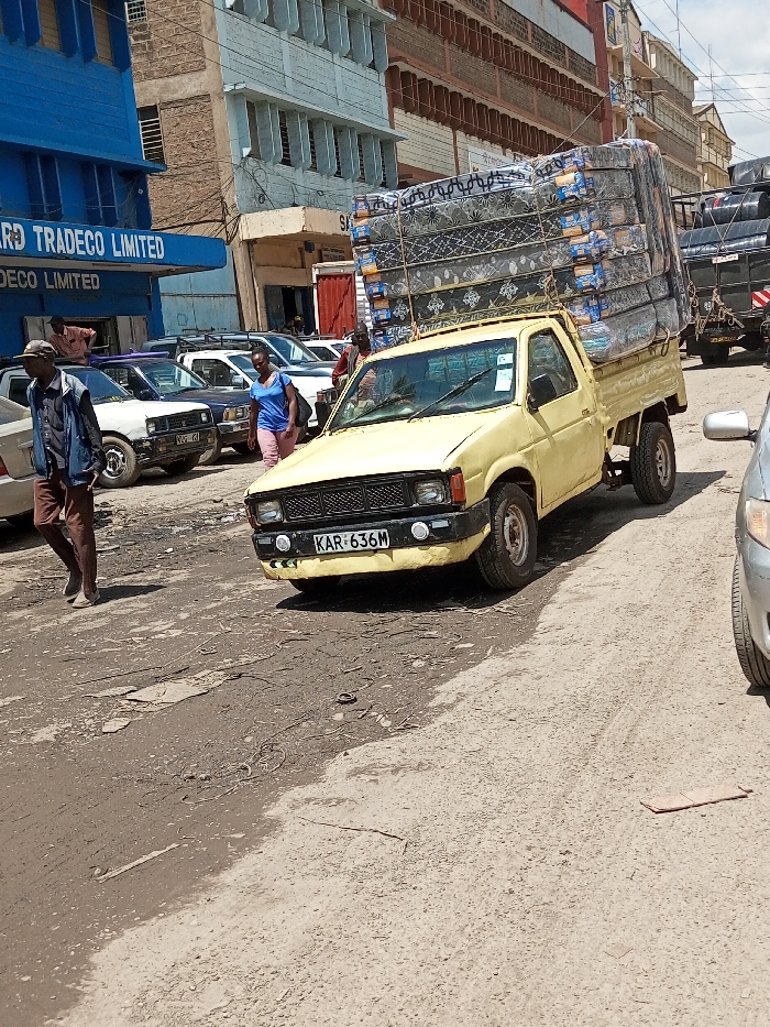 A yellow pickup truck, heavily laden with stacked mattresses, navigates a rough, potholed street. The truck's license plate reads "KAR 636M". Pedestrians walk nearby as the truck is surrounded by other vehicles. The backdrop includes buildings, one of which displays a blue sign reading "ARD TRADECO LIMITED". The sky is overcast.