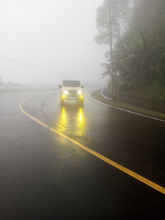 A light-colored compact SUV, possibly a Suzuki Jimny, is positioned centrally on a wet, dark asphalt road, facing the viewer