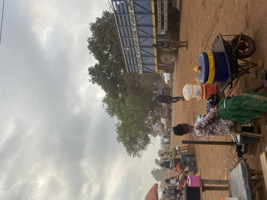 A busy outdoor market scene. A large blue truck with writing on its side sits next to a tree. People mill about in the background. In the foreground, a woman sits next to a wheelbarrow filled with buckets. Others sit at small tables along a dusty street. The sky is overcast. The overall atmosphere suggests a bustling, yet commonplace, daily life scene.