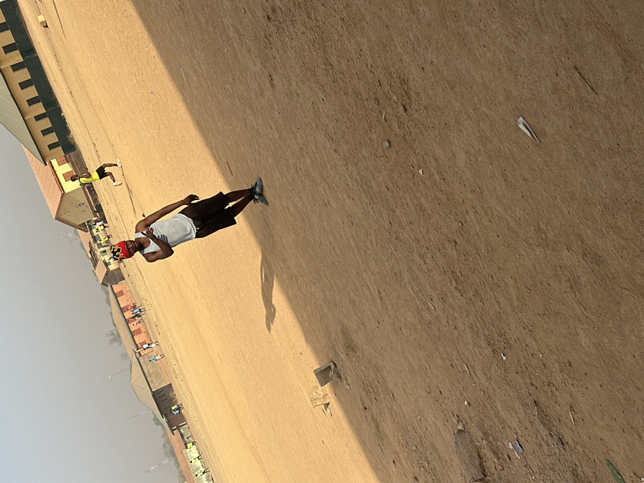 A person wearing a red head wrap, white tank top, and dark shorts stands on a dusty field. Their shadow is cast beside them. In the background, a building with a green roof sits along the edge of the field, and other figures are visible near it. A small, folded piece of paper rests on the ground. The image appears to be taken from a slightly rotated angle.