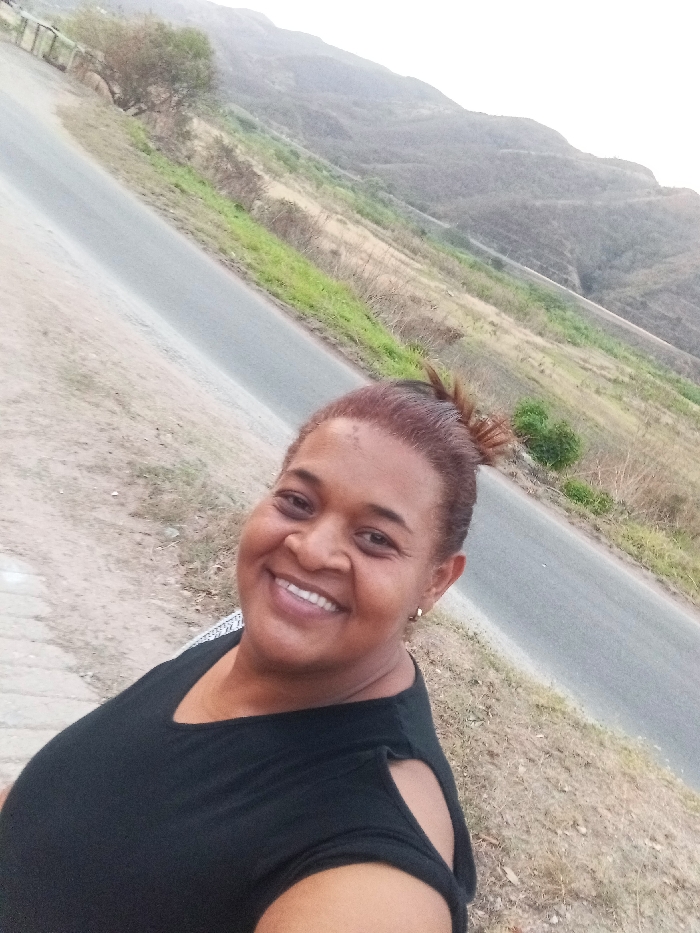 A close-up, chest-up photograph depicts a single adult female in an outdoor setting, presumably near the city of Sabaneta, Venezuela. The subject has dark skin, reddish-brown hair styled in a bun, and is seen smiling broadly directly at the camera. She is wearing a black v-neck top with shoulder cut-outs and a small, gold-colored stud earring in her right ear. The background features a paved road or track running diagonally from the upper left to the lower right. The immediate foreground and areas adjacent to the road consist of dry, light brown soil with sparse green and dry vegetation. In the midground and background, multiple layers of hills or mountains are visible, covered with similar dry vegetation under what appears to be a bright, possibly overcast sky. No other individuals, vehicles, or prominent structures are identifiable.