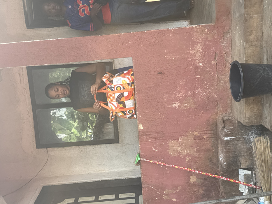 The scene is set outdoors in Aguata, Nigeria, showing a weathered building facade and two individuals. Centrally positioned, an adult female with dark braided hair, wearing a black sleeveless top, stands behind a reddish-brown textured wall. She holds a large, brightly patterned duffel bag with orange handles, featuring geometric and circular designs in orange, white, yellow, black, and brown. Her mouth is slightly open. To her immediate right, a second individual, wearing a blue American football jersey displaying "BILLS" and the number "22," along with blue jeans, is partially visible standing within a dark doorway. This person faces forward. The prominent reddish-brown wall in the foreground shows signs of paint peeling and extends across the lower frame. Leaning against this wall on the left is a long-handled stick with a green top and a red shaft adorned with white and yellow floral patterns. On the ground level below the wall, a traditional straw broom, a black plastic bucket, and miscellaneous debris are visible. Behind the central woman is a dark-framed window through which green foliage is visible. To the far left, a dark door is partially observed. The environment is illuminated by bright daylight.