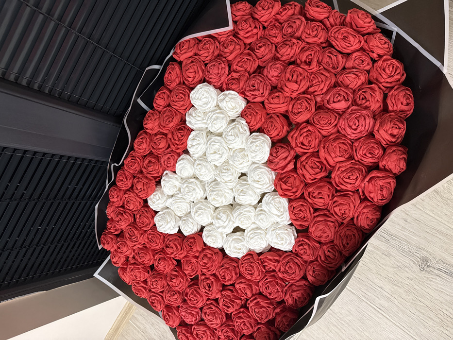 A large bouquet of artificial roses is depicted indoors. The bouquet consists predominantly of red fabric roses, with a distinct heart shape formed by white fabric roses centered within it. The roses are individually crafted, appearing to be made from folded ribbon or fabric. The bouquet is wrapped in black paper with white diagonal accents on its edge, shaped to hold the circular arrangement of flowers. It rests on a light-colored, possibly wooden, floor with visible grain. In the background, dark horizontal louvers or blinds are visible, suggesting a window or partition. No people or interactions are present in the scene. The location is an unspecified indoor setting in Unknown, Unknown.