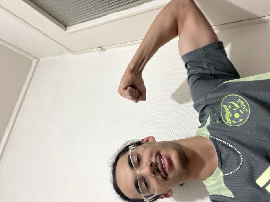 A man wearing glasses and a silver chain poses with his arm raised, fist clenched, in an indoor setting with a fluorescent ceiling light visible in the corner. He's wearing a gray athletic shirt with a circular emblem featuring a soccer ball and Arabic writing. The image is rotated, making the man appear to be posing from below. The background consists of plain white walls. The man has a mustache and braces, and his hair is pulled back.