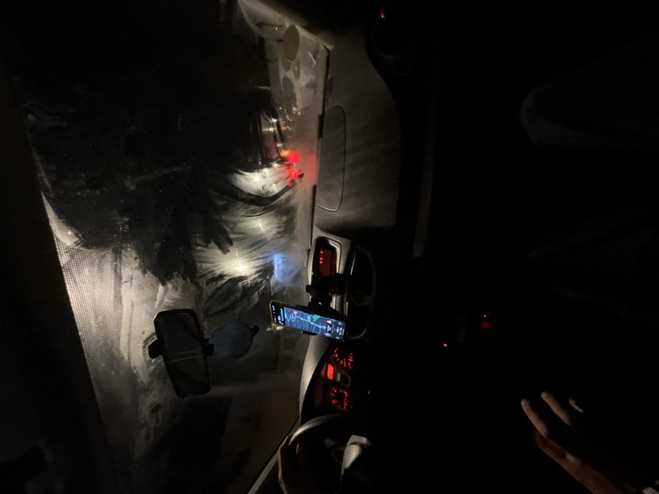 Inside a car at night, a driver holds the steering wheel. The dirty windshield is partially illuminated by headlights. A phone is mounted on the dashboard, displaying a map. The dashboard gauges and various lights provide minimal illumination in the dark interior. The driver's hand is visible on the right side. A rearview mirror is attached to the windshield.