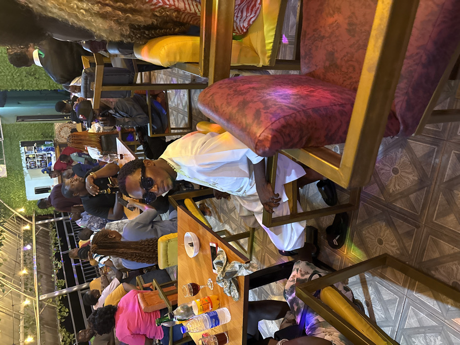 A gathering of people in a brightly lit outdoor or indoor space with many chairs, likely a restaurant or bar. Some people are seated around tables with drinks, while others are standing or sitting in adjacent rows. In the foreground, a man wearing sunglasses and a white outfit sits at a table with water bottles and glasses. Overhead, a tent-like structure and the tops of taller chairs are visible. The floor has a geometric pattern.