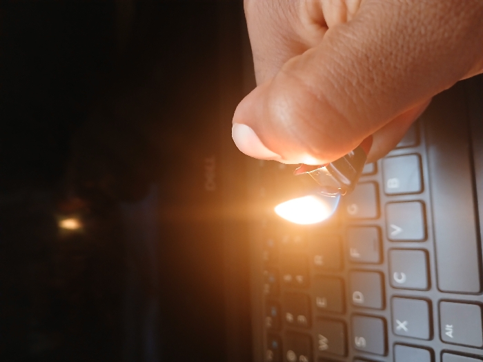 Scene located in Witeithie ward, Kenya. The image presents a close-up view of an adult's right hand holding a lit black disposable lighter over a dark-colored laptop keyboard. The lighter produces a bright, orange-yellow flame with a blue base, serving as the primary light source in the immediate foreground and casting a warm glow on the hand and keyboard. The hand, exhibiting a darker skin tone, is positioned with the thumb and index finger visible, gripping the lighter. The laptop keyboard features dark keys with white lettering; identifiable keys include 'Q', 'W', 'E', 'R', 'T', 'Y', 'A', 'S', 'D', 'F', 'G', 'H', 'Z', 'X', 'C', 'V', 'B', 'N', 'M', and 'Alt'. In the blurred background, the laptop screen is visible, dark, but faintly displays the "DELL" logo and a bright, blurry reflection of a light source in its upper left quadrant. The overall environment appears dimly lit.