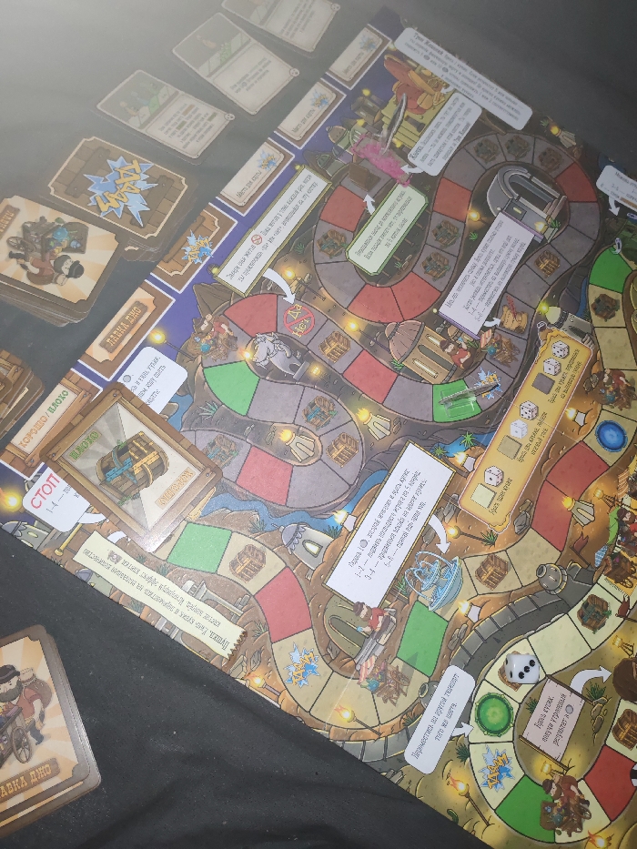 This image, captured in Rostov-on-Don, Russia, displays a board game set up on a dark, matte surface. The game board features an intricate, winding path with various colored spaces (red, green, grey), illustrated with cartoon-style buildings, treasure chests, rivers, and small character figures. All visible text on the board and cards is in Cyrillic script (Russian). Numerous game cards are distributed across the left and top portions of the board, some in stacks and others individually placed. One card prominent on the lower left depicts a figure in a cart, labeled "ЛАВКА ДНО" (SHOP BOTTOM). Another card near the center shows a stylized treasure chest, labeled "ПЛОХО" (BAD). At least three six-sided dice are visible on the board: one shows the '3' face, another the '1' face, and a third is partially visible showing the '6' face. A significant glare from an overhead light source is present across the upper left quadrant, obscuring details on some cards and portions of the board. No individuals are present within the frame; the scene depicts the game in a static state, either prepared for play or paused.
