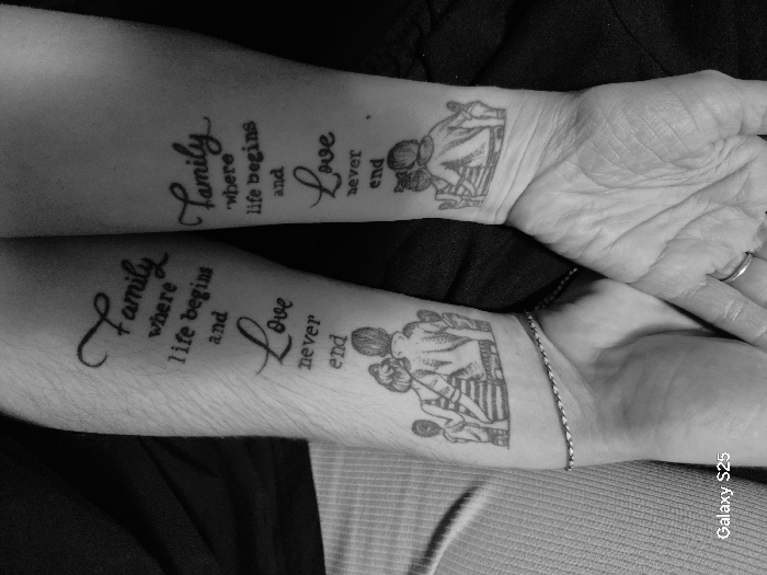 In an unspecified location within Karnalovo, Bulgaria, a black and white close-up photograph displays the lower forearms and hands of two individuals. The arm on the left, exhibiting visible hair follicles, is adorned with a thin, braided, metallic-colored bracelet on the wrist. The arm on the right, displaying smoother skin, has a plain metallic ring on the fourth digit of the visible hand. Both forearms feature identical script tattoos. The text on each arm reads "Family where life begins and Love never end." Below the text on the left forearm is a line-art tattoo depicting four figures: a larger figure (presumed male) facing away, a second larger figure (presumed female) leaning against the first, and two smaller figures (presumed children) positioned to either side. The right forearm features a similar line-art tattoo below the text, showing two larger figures facing away, with two smaller figures positioned to their sides. The subjects are positioned close together, with portions of textured fabrics visible in the background and on the far left. A "Galaxy S25" watermark is present in the lower left corner.