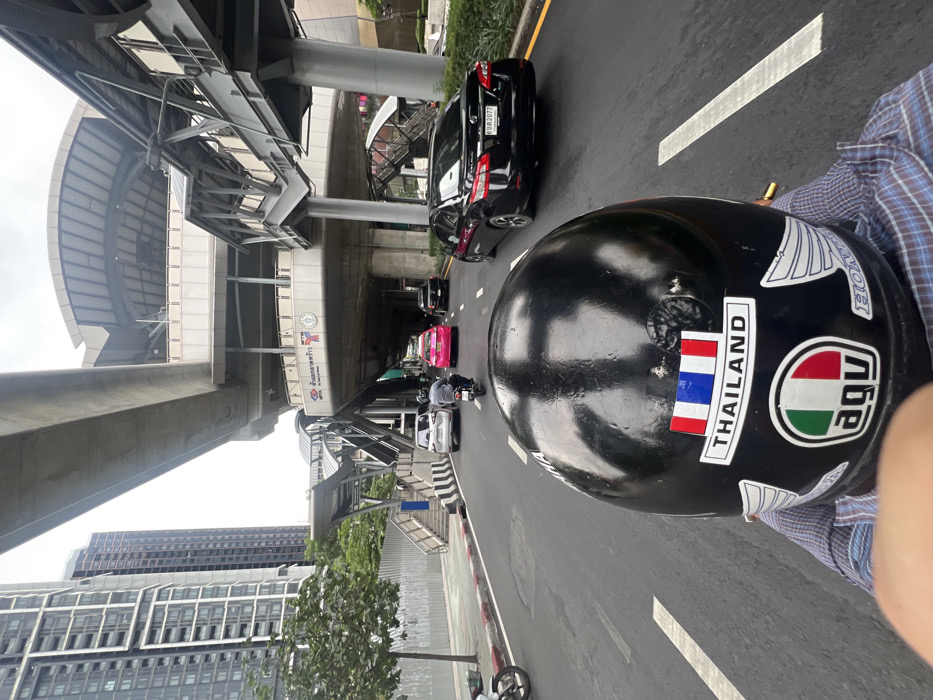The image depicts an urban street scene in Bangkok, Thailand, specifically in front of the elevated Lat Phrao MRT Station. The perspective is from behind a person, likely a passenger, riding a motorcycle. The lower central foreground is dominated by the back of a black motorcycle helmet, adorned with a rectangular "THAILAND" sticker featuring a blue, white, and red flag design, and a circular "AGV" sticker with Italian flag colors. A human finger is partially visible in the lower left. The individual wearing the helmet is clothed in a blue and white plaid long-sleeved shirt. The road ahead is asphalt with white dashed lane markings, showing traffic flowing away from the camera. Vehicles in motion include a silver SUV, a person on another motorcycle, a bright pink taxi, and a black Nissan sedan with Thailand license plate "6กค 2077" from Bangkok. To the left, a concrete curb with black and white stripes separates the road from a pedestrian area featuring a small tree and some foliage. The background is dominated by the concrete structure of the elevated Lat Phrao MRT Station, identifiable by signage displaying "MRTA" and "สถานีลาดพร้าว" (Lat Phrao Station) in Thai script. The station features a modern, curved roof and is supported by large concrete pillars. Multiple staircases and walkways provide access to the elevated platforms. In the far left background, several tall, modern high-rise buildings are visible under an overcast sky, indicating a dense metropolitan area.