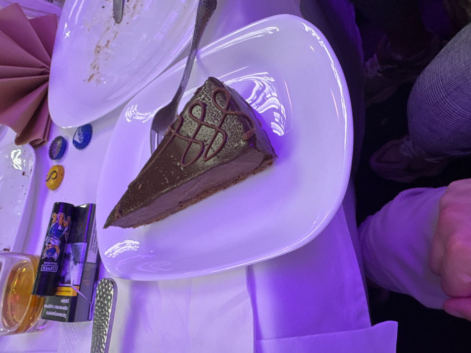 The image displays an indoor dining scene in Stara Zagora, Bulgaria, under distinct purple ambient lighting. A white tablecloth covers the table. In the center, a triangular slice of chocolate cake with dark chocolate icing and a decorative brown swirl is presented on a white, rectangular-oval plate. A silver dessert spoon with an ornate handle rests on the plate next to the cake. To the right, a second white, rectangular-oval plate shows food residue and a visible portion of a silver utensil. A folded pink linen napkin is positioned near this plate. In the upper left, a clear glass tumbler contains an amber liquid. Below it, a black cigarette pack with Bulgarian text is visible, topped by a black Clipper brand lighter featuring a multi-colored cartoon character design. Several metal bottle caps (yellow, blue, green) are scattered on the tablecloth. The lower portion of the frame shows the legs of two individuals beneath the table; one person wears grey plaid trousers and brown shoes, while another person's hand, partially covered by a white sleeve, is intertwined with a second hand.