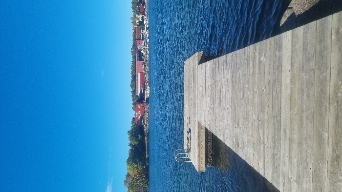 The image depicts a waterfront scene in Västervik, Sweden, under a clear, cloudless blue sky. A weathered, light-gray wooden dock, T-shaped at its terminus, extends into the dark blue, rippled water from the bottom foreground. A silver-colored metal swimming ladder or handrail is affixed to the left side of the dock's end. Across the water, the background shoreline features a line of trees with mixed green and autumnal foliage on the left. To the right, a cluster of large red-roofed buildings, possibly part of a boatyard or industrial complex, stands behind a marina where numerous white and light-colored boats are either stored on land or moored. No individuals or specific actions are discernible within the frame. The scene is illuminated by bright daylight.