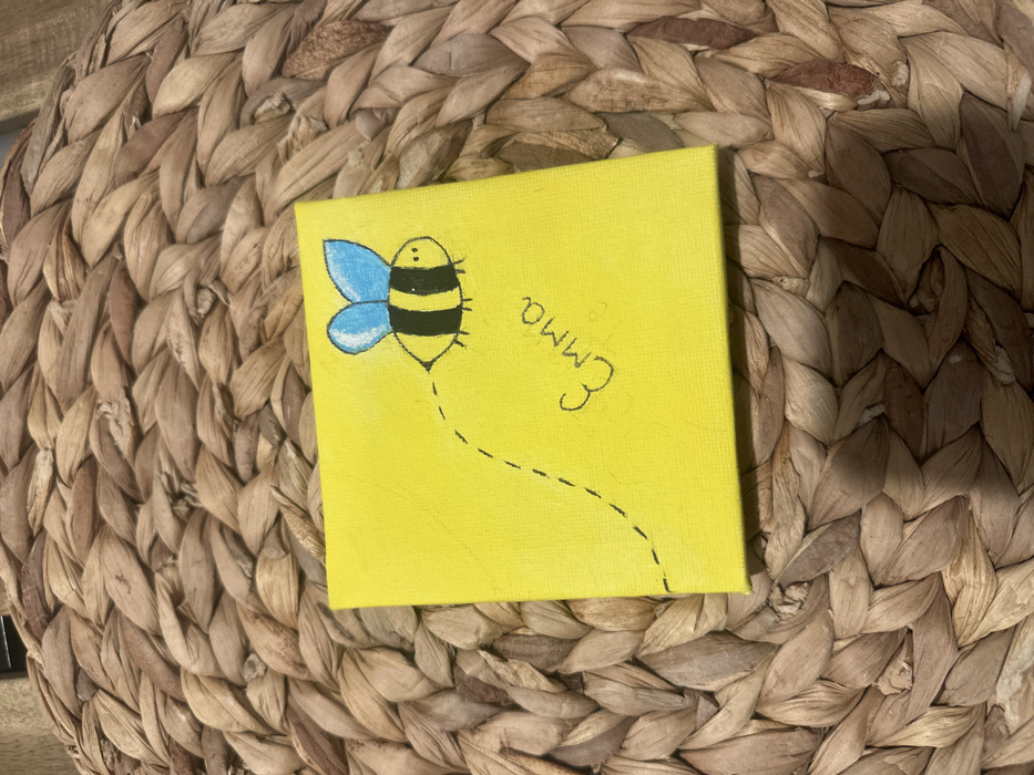 A small, square canvas, predominantly yellow in color, is positioned centrally on a light brown, tightly woven natural fiber mat. The canvas depicts a stylized cartoon bee with black and yellow striped body, two small black antennae, and two light blue wings, flying towards the upper right. A dashed black line trails behind the bee, arcing towards the bottom left corner of the canvas. The name "Emma" is written in black script below and to the left of the bee. The woven mat exhibits a distinct basket-weave pattern. This scene is located in Lozen, Bulgaria.