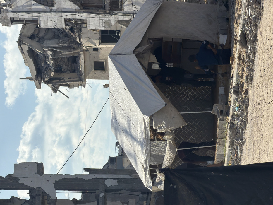 A makeshift tent stands next to a severely damaged building. The structure is crumbling with exposed rebar and shattered walls. Two figures are visible inside the tent. Debris litters the ground. The sky is partly cloudy.