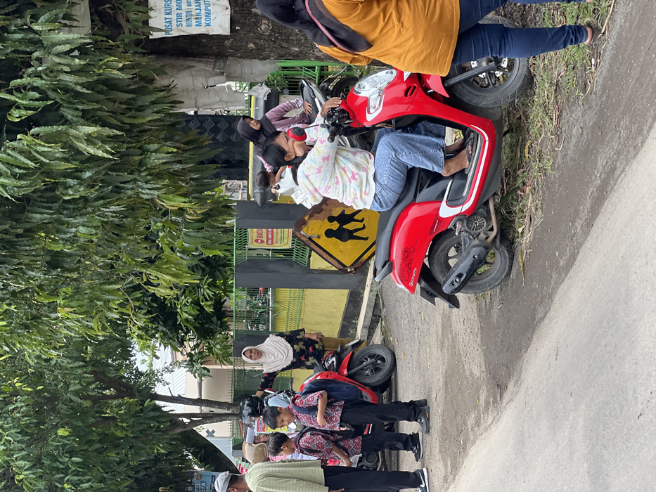 The image displays an outdoor street scene in Wedarijaksa, Indonesia, populated by multiple individuals and parked or stationary motor scooters. The foreground consists of a grey asphalt or concrete road surface with a dirt and sparse grass verge on the right. On the left, an adult male wearing a light green shirt and grey cap is partially visible. Two young males, identifiable as students by their matching batik-patterned short-sleeved shirts, black trousers, and backpacks (one red, one blue), stand near a red Honda Scoopy scooter. An adult female, clad in a light beige hijab and a dark floral-patterned long-sleeved shirt, stands next to the students and scooter, extending her right arm slightly. Behind them, a yellow metal fence with dark grey posts encloses a property, with a light-colored building partially visible through dense green foliage. A weathered yellow diamond-shaped road sign, depicting two black silhouettes of children, leans against the fence. Adjacent to it, a red rectangular sign with partially visible white text, including "BATA," is attached to the fence. On the right side of the frame, an adult female wearing a white patterned hoodie, blue jeans, and dark flip-flops is seated on a red Honda Scoopy scooter, facing towards the left. Her right hand is positioned near her mouth area. Behind her, another adult female in a dark hijab and light pink long-sleeved shirt is seated on a dark-colored scooter, with a young child positioned in front of her. Partially visible on the far right, an adult female in an orange top and dark blue jeans stands. A white rectangular sign affixed to a tree trunk is legible, indicating "PUSAT KURSUS STIR MOBIL" (Driving Course Center) and "MONTI (Motor & Komputer)" (Motor & Computer). The scene is illuminated by ambient daylight, with lush green trees dominating the upper and background portions of the image.