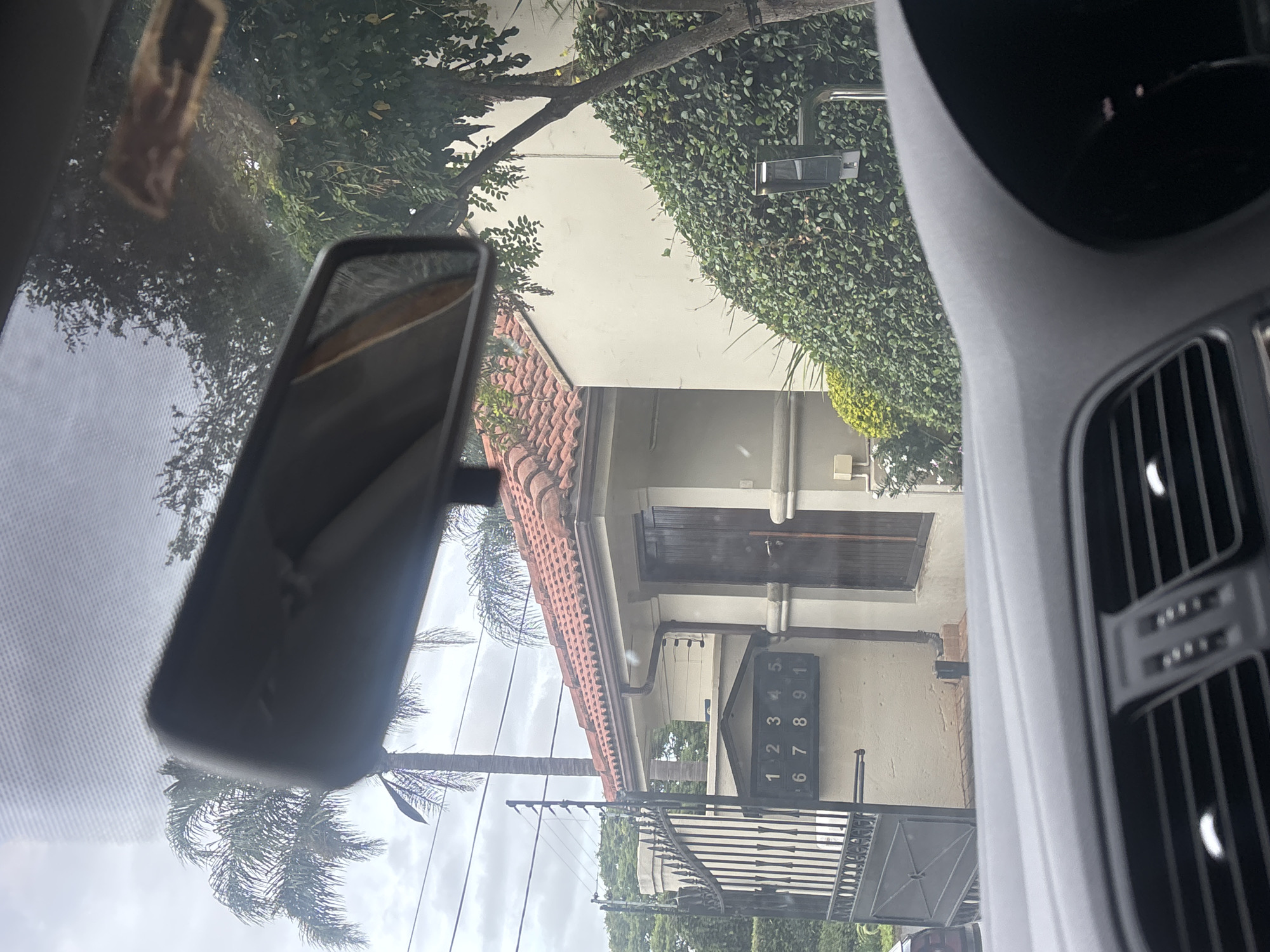 The image, captured from within a vehicle, displays a residential property entrance in Durban North, South Africa. The vehicle's dark grey dashboard and an air vent occupy the lower foreground. A rearview mirror is centrally positioned, reflecting interior elements. The scene outside features a cream-colored wall or gatehouse structure with a terracotta-tiled roof. A dark metal gate with pointed finials and an electric fence is partially open on the left. Mounted on the wall adjacent to the gate is a metal mailbox unit, horizontally oriented, with two rows of numbers: "1 2 3 4 5" on the upper row and "6 7 8 9 1" on the lower row. A dark wooden door with a modern handle is visible within the gatehouse structure. A dark brown downspout runs vertically along the wall. Near the ground, a black rectangular object is positioned below the mailboxes. To the right, an electronic access control device is mounted on a metallic pole, partially obscured by dense green foliage, which forms a hedge along the property boundary. The background shows an overcast sky, several tall palm trees with visible fronds, and additional green trees and power lines. No individuals are present in the frame.