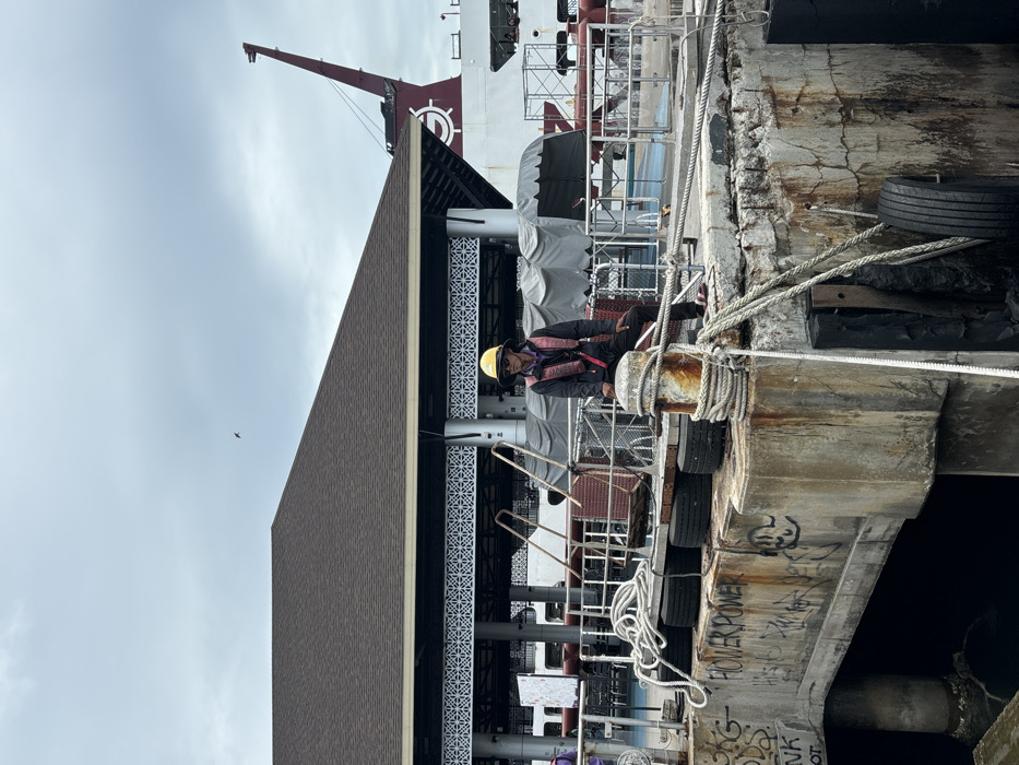 The image depicts a concrete pier at the port of Thong Sala, Thailand, under an overcast sky. In the mid-ground, an adult male is visible, wearing a yellow hard hat, a dark long-sleeved shirt, dark trousers, and a red life vest over his shirt. He is leaning against a rusty metal bollard, which has thick ropes coiled around it. The pier itself is constructed from weathered concrete, showing cracks, stains, and graffiti, including "FLOWER POWER." Several worn tires are stacked horizontally along the pier's edge, serving as fenders. In the background, a building with a dark brown pitched roof and an ornate white patterned facade is present. To the right of this building, the upper portion of a large white ferry is visible, featuring a prominent red mast/funnel adorned with a white symbol resembling a stylized gear with a central "G" or "C." A small dark bird is flying in the upper left quadrant of the sky. Other objects on the pier include additional coiled ropes, red-framed seats, and a grey tarp-covered item. The scene conveys an active maritime environment.