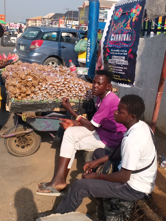 Two young men are seated beside a cart piled high with individually wrapped snacks or cookies. One man wears a purple shirt and white pants, and the other sports a white shirt and dark pants. A sign for the "Onumonu Street Carnival" dated for December 2025 is posted nearby. A blue car is visible in the background, adding to the street scene ambiance. A Coca-Cola bottle sits atop the cart laden with snacks.