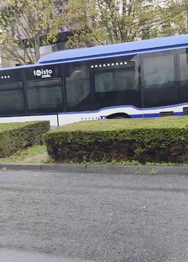 blue and white bus, labeled "Twisto," passing by on a wet street. The camera follows the bus as it moves from right to left. A line of trimmed bushes separates the street from a grassy area with trees. In the background, there's a pedestrian bridge and a building. The weather appears overcast. The road is asphalt. The camera then moves to a crosswalk on the street.
