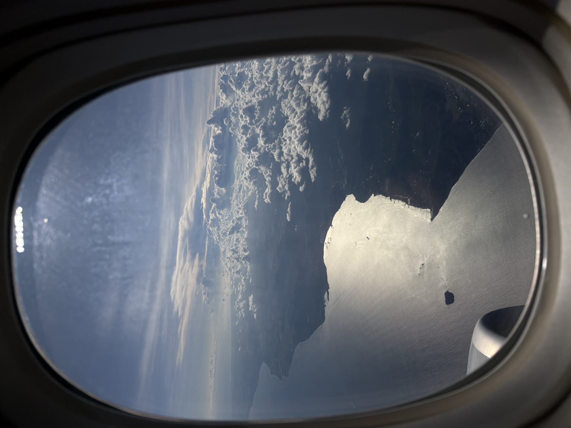 view from an airplane window. Outside the window, there is a coastline with land on the left and the ocean on the right. The water has a bright reflection from the sun. There is cloud cover on the horizon. Part of the airplane's wing is visible in the bottom-right corner. The location of the city is unknown.