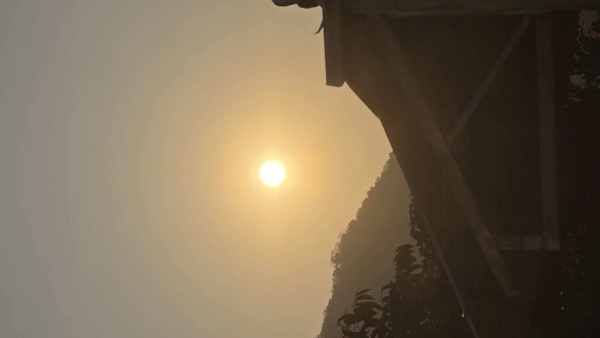 A hazy sun shines in the sky above Bac Natural Heritage Area Trang, Vietnam. A partially obscured mountain ridge rises to the right of the sun. The silhouette of a building's eaves occupies the upper right corner. The scene suggests either sunrise or sunset conditions with a layer of haze present in the atmosphere.