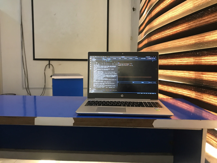 A silver HP laptop is positioned centrally on a blue table with a light-colored wooden edge. The laptop screen displays lines of code or text on a dark background. To the left, a white projection screen with a black border is mounted on a white wall. A black cable hangs vertically from above the screen, looping down towards a rectangular blue and white object on the floor beneath the screen. To the right, horizontal blinds with alternating dark brown and light beige stripes cover a window. The room is unoccupied. The scene is set indoors in Calabar, Nigeria, in what appears to be a classroom or training room environment.