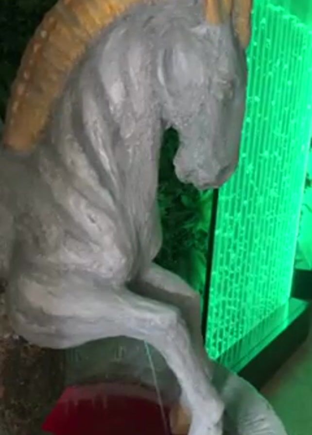 gray statue of a horse, with a gold mane and hooves, set against a backdrop of a green illuminated wall. The horse statue is positioned on a base, with water trickling down from the horse's front leg into a red basin below. The surroundings include greenery, contributing to an outdoor ambiance.