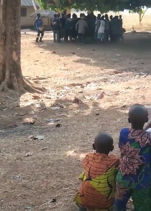 In a medium shot taken at ground level, the scene unfolds in an outdoor space, marked by a dirt ground littered with trash. Two young children are positioned in the foreground, their backs to the camera. One child is wearing a vibrant orange, brown, and green patterned shirt, while the other is clad in a blue and green floral pattern. They are watching a group of people standing some distance away. In the background, a cluster of individuals stands beneath the shade of a tree. The people are of various sizes and are dressed in different colored clothes, indicating that they are not part of a uniform. A building with a corrugated roof can be seen in the background. A tree trunk dominates the left of the frame, with its exposed roots and dense branches. The ground around the tree is strewn with leaves, small branches, and other debris. A discarded plastic bottle with a red cap lies on the ground near the children. The lighting suggests it is daytime, with shadows cast by the tree and the building. The location appears to be a rural or semi-rural area.