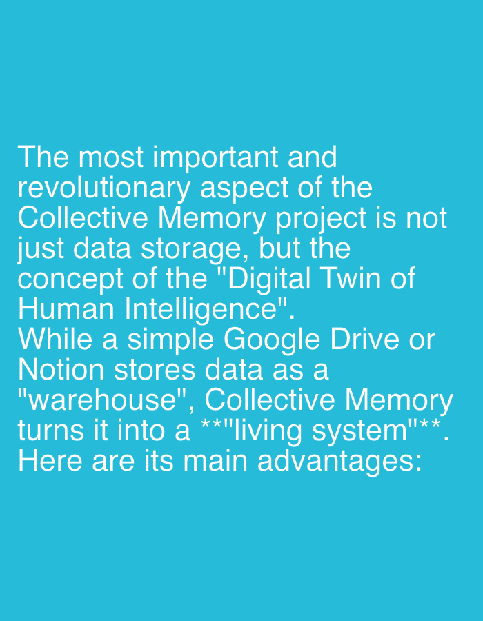 Against a turquoise background, text explains the significance of the "Collective Memory" project. It's more than just data storage; it's a "Digital Twin of Human Intelligence." Unlike Google Drive or Notion, which are mere "warehouses," Collective Memory transforms data into a "**living system**." This suggests dynamic, interactive capabilities. The passage ends by announcing the project's main advantages, indicating that more details are to follow.