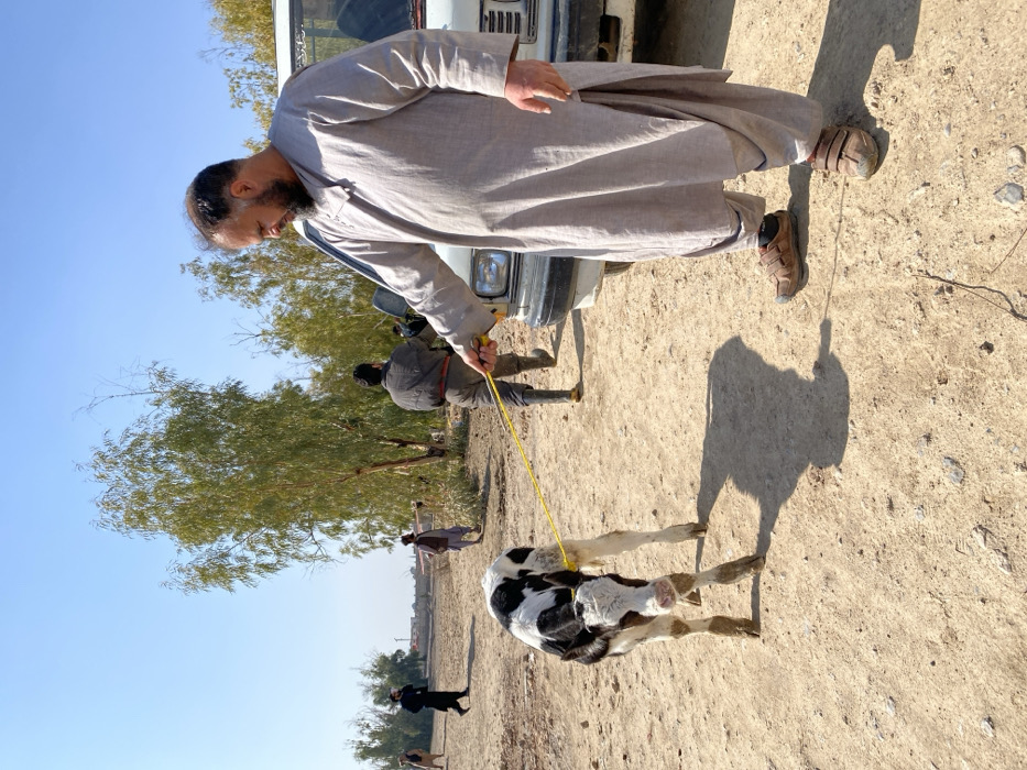 - "A man in traditional garb leads a black and white calf on a yellow rope across a dusty, sunlit landscape" by FM-B5wmg2, licensed under CC BY 4.0