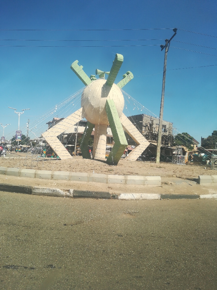 This image presents a prominent urban roundabout located in Jos, Nigeria, under a clear, bright blue sky