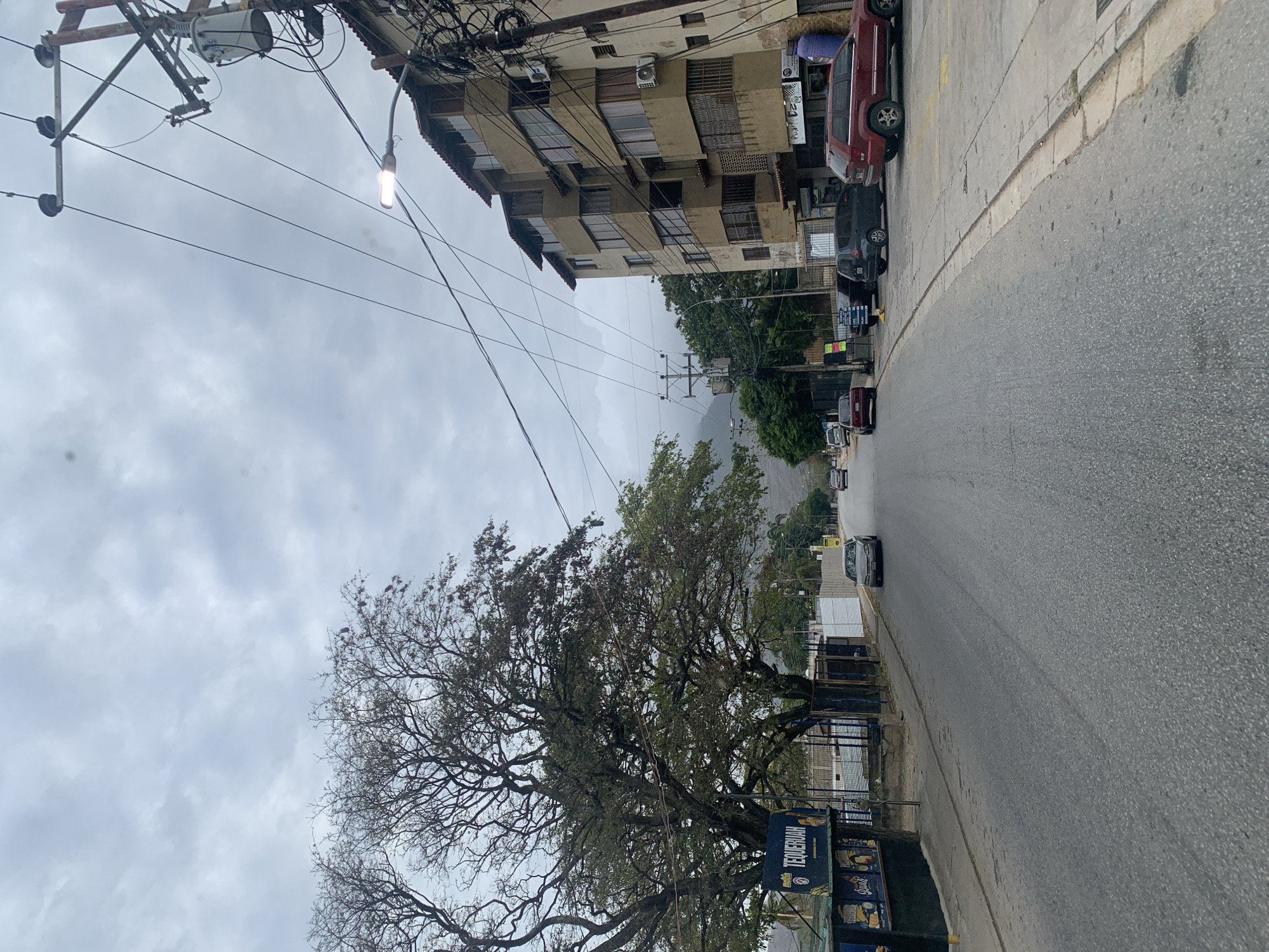 The image depicts a street scene in La Asuncion, Venezuela. The view is from the roadside, looking along a straight stretch of asphalt road. The road is bordered on one side by a sidewalk and several parked cars, including a maroon SUV. Buildings line the street, with a multi-story apartment complex dominating the upper-left frame. A utility pole with an active street light and cluttered wiring is visible near the building. A large, leafless tree stands along the roadside, partially obscuring a fence and some commercial signage. In the distance, the road leads towards a mountainous backdrop. The sky is overcast, creating a diffused, grey lighting condition. Several other vehicles are seen in the distance on the road.