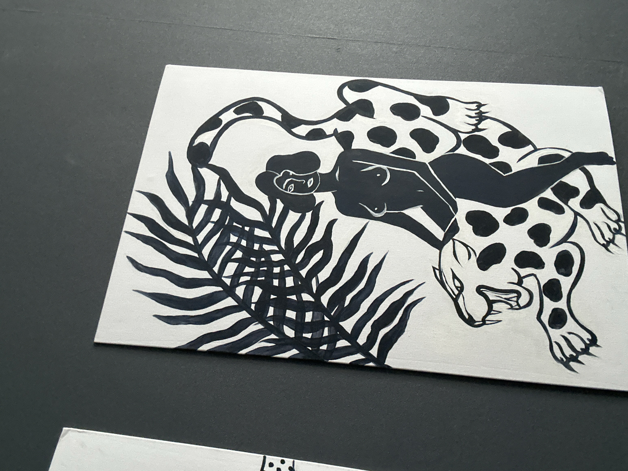 A rectangular, vertically oriented canvas displaying a black and white drawing is positioned against a dark gray wall. The artwork depicts a stylized, unclothed female figure in solid black silhouette, with short, bob-cut hair and minimal white outlines for facial features and breasts. She is seated astride a large, spotted feline, likely a leopard or jaguar, which is predominantly white with irregular black spots. The feline faces left, mouth open in a snarl, revealing teeth, and its claws are visible. Its spotted tail curves upwards behind the female figure. Above and to the left of the figures, a large, fanning palm-like frond is rendered in solid black. To the left of the main canvas, a portion of another white rectangular object is partially visible. The scene appears to be indoors, under even lighting.