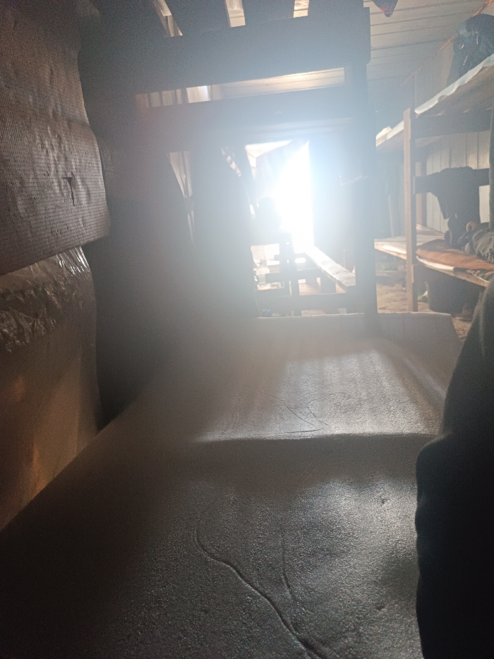 The image depicts the interior of a structure, possibly a temporary shelter or workshop, located in the city of Unknown, Unknown. The scene is primarily dark, illuminated by an intense white light source originating from an opening in the center-background, causing significant lens flare and obscuring immediate details around it. In the foreground, a textured, irregular, dark grey-brown surface, possibly a floor or large mat, extends across the bottom of the frame, showing curvilinear indentations. To the left, a wall section is covered with a beige, textured insulation material, partially wrapped in clear plastic sheeting and secured by dark fasteners. To the right, a two-tiered wooden bunk bed frame is visible. The lower bunk contains an orange-brown sleeping mat or blanket. The upper bunk holds dark fabric items, consistent with clothing or a personal bag. Structural elements, including exposed wooden beams and corrugated metal paneling, define the background and ceiling areas. No individuals are present or clearly identifiable within the frame.