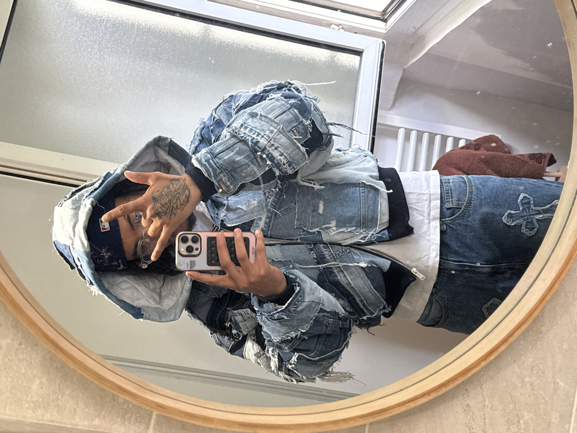 The image depicts a mirror selfie of an individual in an indoor setting. The person is reflected in a large, oval mirror with a light wooden frame. They are wearing clear-framed glasses, a blue beanie with a white "ML" logo, and have long, dark hair visible beneath the beanie and hood. The individual is dressed in a distinctive, distressed patchwork denim jacket featuring various shades of blue denim with frayed edges and a white quilted lining in the hood. Underneath, a white t-shirt is visible. Blue denim jeans are worn, featuring a white cross-shaped patch or embroidery on the right upper thigh. The person holds a light-colored smartphone with multiple rear cameras in their right hand, using it to capture the reflection. Their left hand is raised, forming a "rock on" or "horns" gesture, with extensive black tattooing visible on the back of the hand. A small tattoo is also present on the inner wrist of the right hand. The background visible in the mirror's reflection includes a tiled wall with light-colored, rectangular tiles on the left. To the right, a white-framed window with frosted or textured glass obscures the view outside. Below the window, a white horizontal-bar radiator is visible, and a reddish-brown patterned towel or garment is draped over an unseen object nearby. The image depicts an indoor scene; however, no specific visual identifiers within the image confirm its location as Massy, France.