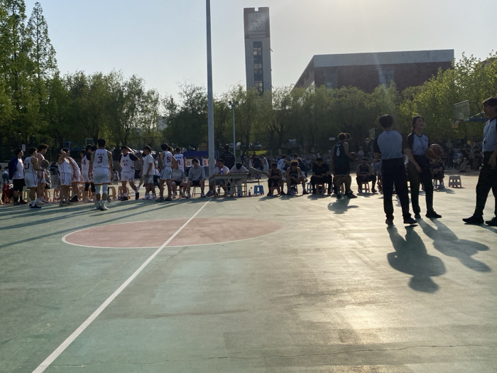 basketball court in Qingdao, China, at the coordinates 36.005, 120.115. The court is green with white lines and a red circle at center court. There are two teams of young men facing each other, with a few spectators seated on benches along the sides. The players wear white jerseys with red and blue accents, and the spectators are wearing casual clothing. One player holds a basketball. The players are engaged in a game, with the spectators watching intently. The sun is shining brightly and casting long shadows. There is a tall building in the background with a clock tower on top. The building appears to be part of a university campus, as there are trees and other buildings in the background. The scene is a typical day at a basketball court in Qingdao, China.