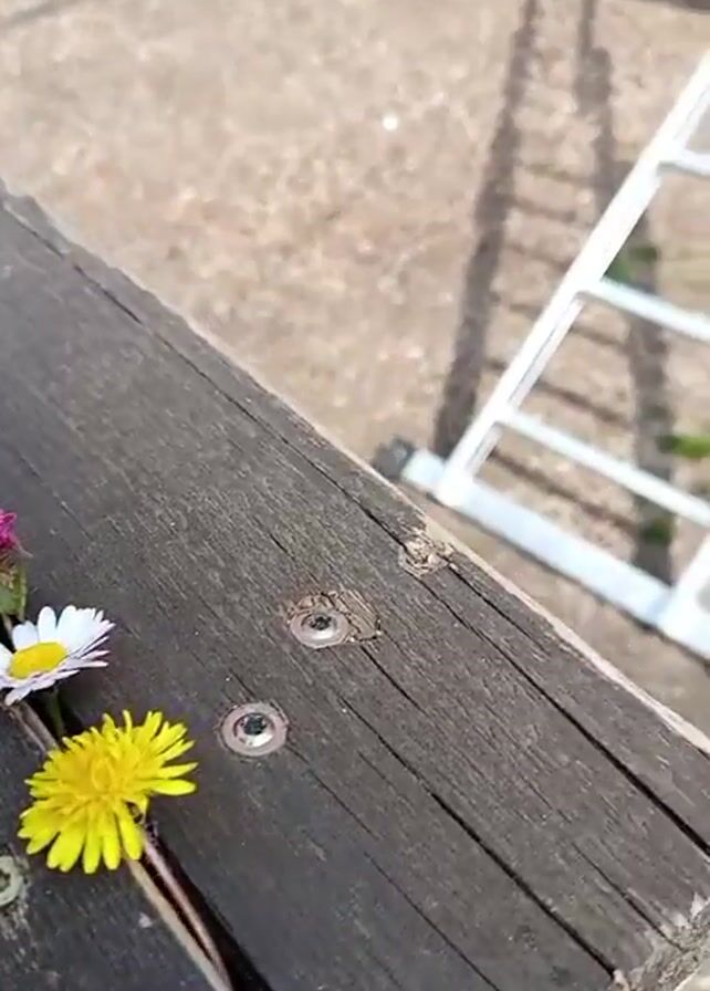 The camera pans up from a close-up of a wooden park bench with three small flowers nestled between the slats to reveal a leaning aluminum ladder leading up to a treehouse structure