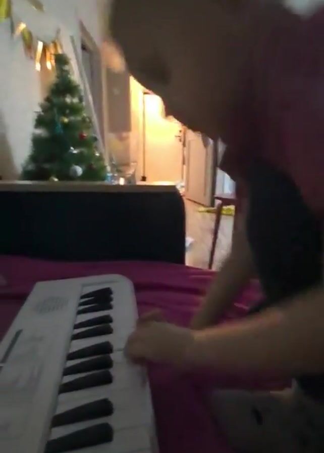 A young child with blonde hair is sitting on a bed with a red-purple blanket, playing a small, white electronic keyboard. A Christmas tree is visible in the background, decorated with ornaments and lights. A doorway and a refrigerator can be seen in the background as well. The child is pressing the keys on the keyboard and the camera angle makes them seem out of focus. There is an open doorway visible in the distance, with a stool beside it. Garland is hanging near the ceiling and out of focus. The room appears to be lived-in.