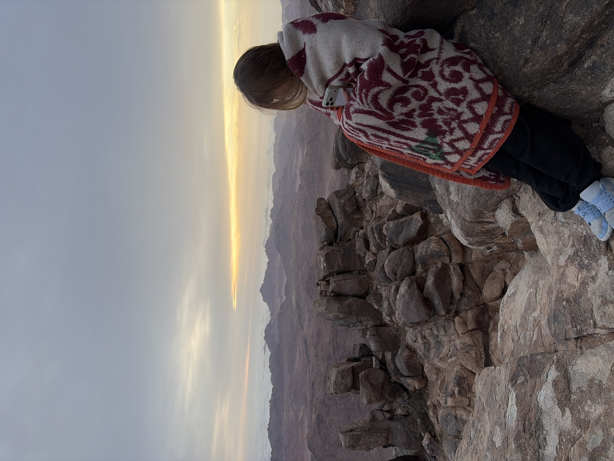 A young woman stands wrapped in a patterned blanket on a rocky outcrop, likely the summit of Mount Sinai in Saint Catherine, Egypt