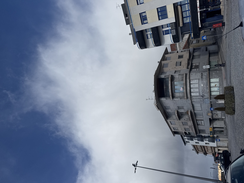 The image depicts a street scene at Praça do Hospital, Bragança, Portugal. The sky is partially blue in the upper left and upper right portions, transitioning to extensive white and light grey cloud cover dominating the central and lower sky. In the foreground, a dark vehicle is partially visible on the lower left. The street surface is composed of cobblestones. A tall, dark grey street lamp post with two light fixtures extends upwards on the left side of the frame. The central structure is a multi-story, grey-toned concrete building with a distinctive rounded corner. It features multiple balconies with metal railings on its upper floors. The ground floor displays signage for "CLÍNICA DO ARCO DA ESTAÇÃO" and has large display windows. A "VENDE-SE" (For Sale) sign is visible in a window on a first-floor balcony of the rounded corner. To the right of this central building is another multi-story building with a facade primarily in white and light yellow sections, accented by blue-framed windows and dark blue balconies. A red cylindrical post box is situated on the sidewalk in front of this building, and a sign for "AUTO PEÇAS" is visible below. On the cobblestone street level, a circular planter containing two cone-shaped evergreen shrubs is present. Traffic signage, including a blue pedestrian crossing sign and a triangular yield sign, is posted near the corner of the grey building. A single individual, dressed in dark clothing, stands on the sidewalk near the rounded corner of the grey building, facing away from the camera. Additional vehicles are parked along the street further to the left.