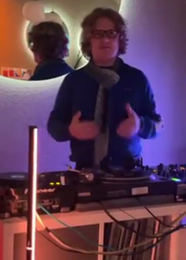 A man with curly blonde hair and glasses is DJing at a party. He's wearing a blue jacket with yellow writing on the sleeves, and a patterned scarf. He's standing behind a white shelving unit with a Pioneer DJ mixer and two turntables. The turntables have vinyl records on them. There's a row of records stored in the shelving unit below. An LED light stick shines orange to the left of the man. There is a round mirror behind the man, which is reflecting a partial view of the room. The lighting in the room is dim, with a purple cast on the wall behind the man. He is moving his hands and body to the music, appearing to enjoy himself.