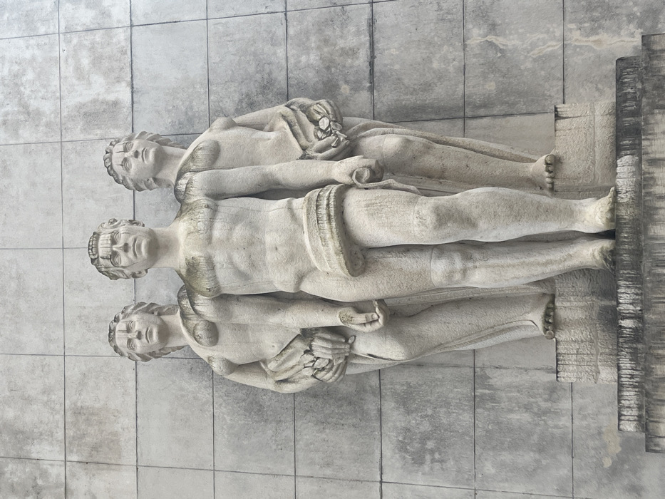 The image displays a monumental, light-colored stone sculpture featuring three idealized human figures, prominently affixed to a large, light-grey tiled stone wall