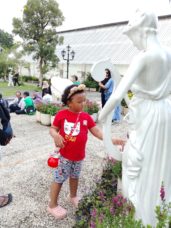 The image depicts an outdoor area in Ngadirejo, Indonesia, characterized by a light-colored gravel ground covering. In the immediate foreground, a young child, approximately 3-5 years old, stands facing right. The child wears a red short-sleeved t-shirt with a white cat graphic and "MEOW!" text, patterned shorts, and light pink clogs. A clear plastic bottle with a red base is suspended from a red strap across the child's body. The child's right hand extends towards and appears to touch a curved white element of a large white classical-style female statue, which is viewed from the back and right side. This statue is surrounded by purple flowering plants in a white planter. In the mid-ground, a row of white planters containing red and purple flowers extends horizontally. To the left, a group of approximately five adults is seated on the gravel, including individuals wearing a black shirt, a white shirt, and a green t-shirt with a black backpack. Further back on the left, two individuals in white clothing are walking. In the mid-ground on the right, a woman wearing a black shirt and sunglasses is holding a smartphone, apparently capturing a photograph. Another woman in a light blue top is partially visible behind the statue. The background features a large tree with green foliage on the left and a tall black street lamp with three lanterns. Behind these elements, a long, light-colored building with a corrugated metal roof and weathered walls is prominently visible, suggesting an industrial or warehouse structure. The sky is bright, indicating daylight conditions.