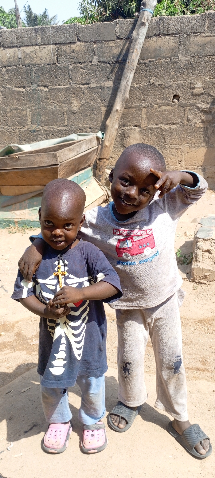 Two young males are depicted standing outdoors in Ungwan Liman, Nigeria, on what appears to be a dirt or sand surface. The subject on the left, a younger child, wears a dark blue short-sleeved t-shirt with a white skeleton design and a red heart, light blue jeans, and pink slip-on clogs. He holds a gold-colored crucifix pendant suspended from a dark string. The subject on the right, an older child, wears a light grey long-sleeved shirt with a red fire truck appliqué and "attention everyone" text, light grey sweatpants with dark patches on the knees, and dark grey slide sandals. His right arm is draped over the left child's shoulder. Both individuals are looking forward towards the viewer, with the older child smiling and extending his left index finger towards his temple. In the background, a weathered grey concrete block wall is visible. To the left of the subjects, a wooden trough or planter is propped against the wall. A rustic wooden pole leans against the wall on the right side of the frame. Green foliage is visible above the wall in the upper background. The scene is illuminated by natural daylight.