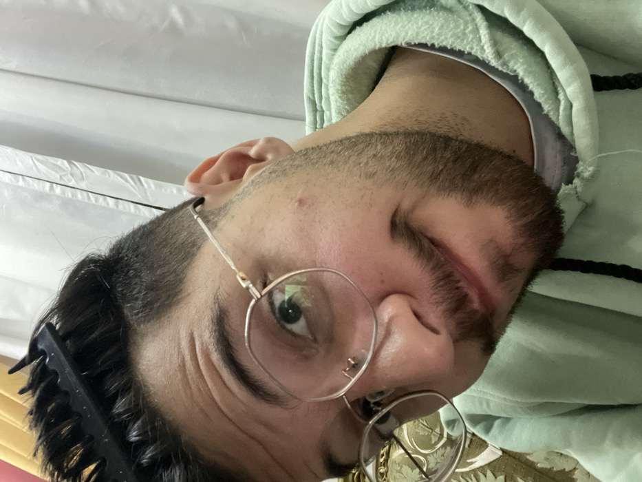 A close-up shot shows a man with brown hair, a beard, and glasses, tilted to the side. He wears a light green hoodie. A black comb is partially visible in his hair. The background includes a white surface and patterned fabric. The man's eye is clearly visible through the lens of his glasses.